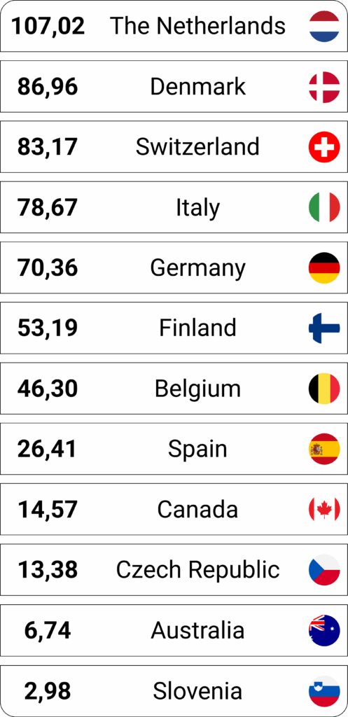 Netherlands remains the clear No. 1, with a strong 20-point lead over Denmark.